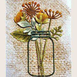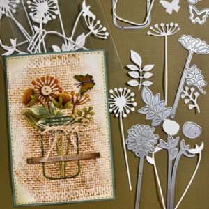 Jar of Flowers Craft Die featuring a jar and flowers is a thin, precision-cut steel tool designed for paper crafting. The main shape is a mason-style jar, with clean, smooth outlines that create a classic, slightly rounded silhouette. Inside or emerging from the jar are delicate floral elements—slender stems, leaves, and blossoms—cut with fine detail to capture petal shapes and natural curves.