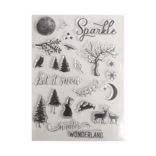 Winter Wonderland Stamp Set is a beautiful set of stamps with a wintery theme. This set of stamps would be perfect for any Christmas themed craft project. With trees, woodland animals, leaves and moons, this set can be mix and matched to create different scenes. These silhouette stamps would look stunning stamped onto a distress inked background or a night sky. add some glitter and sparkle to create a wintery scene. With sentiments included this is a versatile set. The set of silicone stamps can be used over and over. Once you have finished stamping your images, wipe off any excess ink and replace back into the pack.
